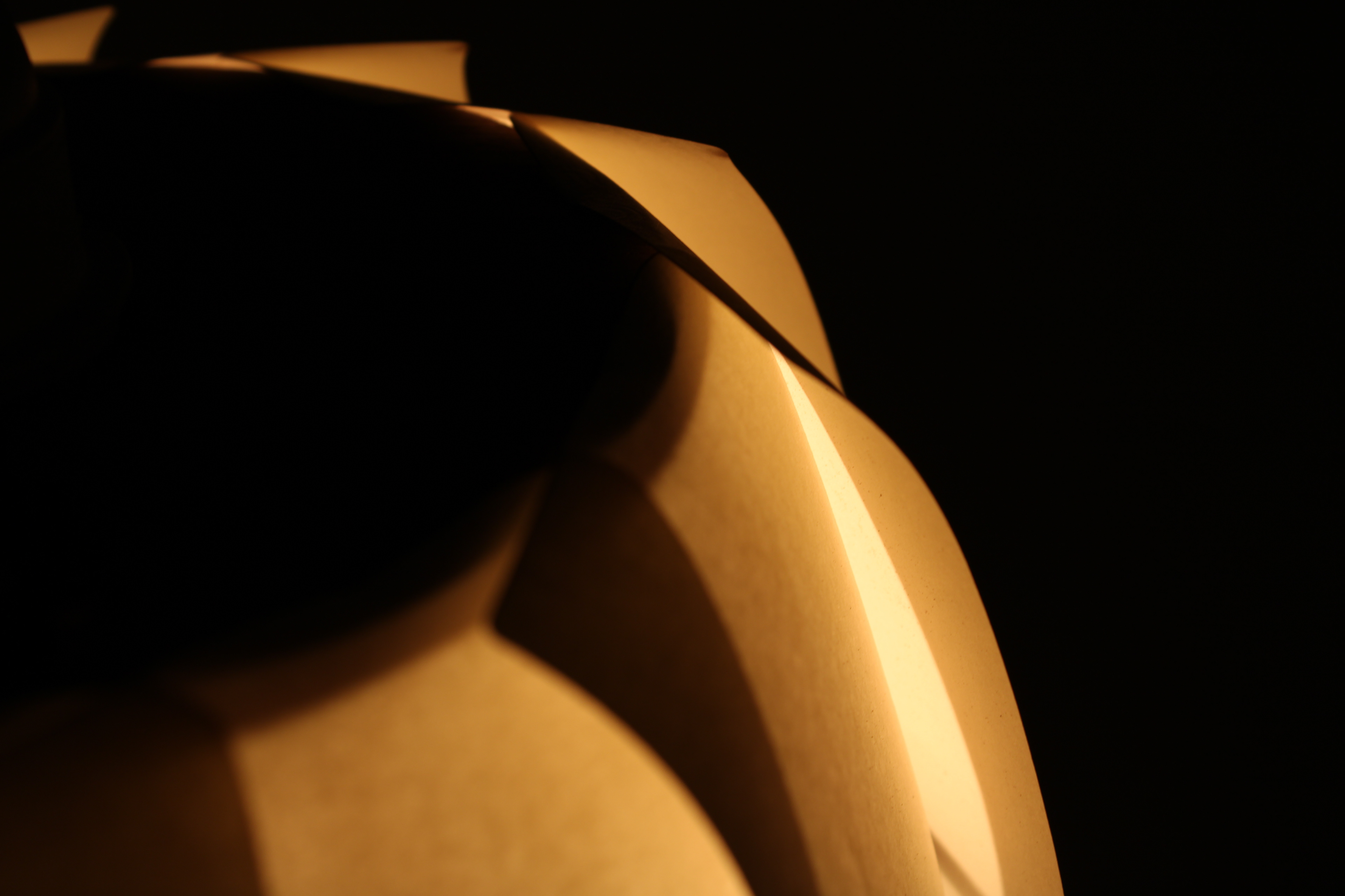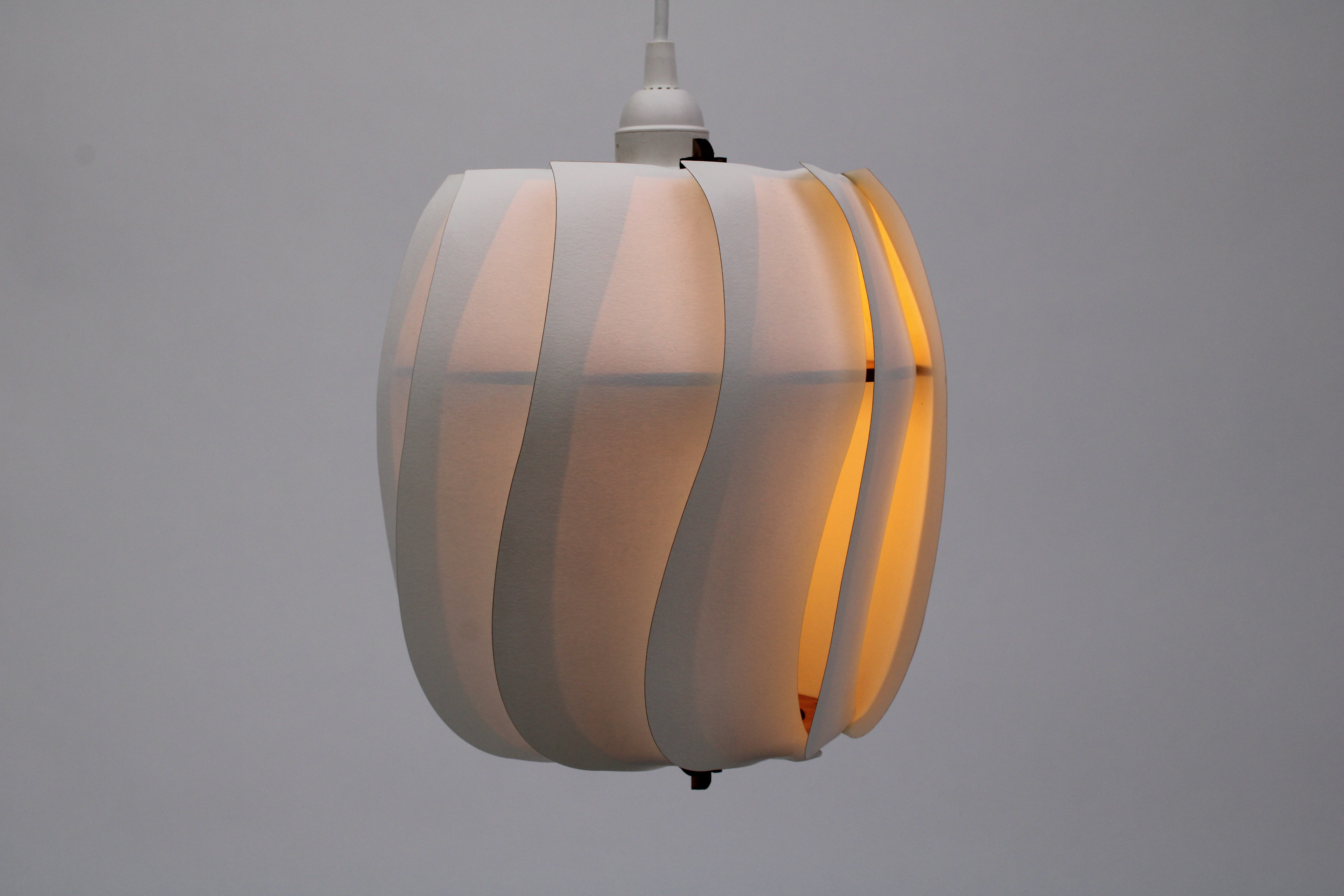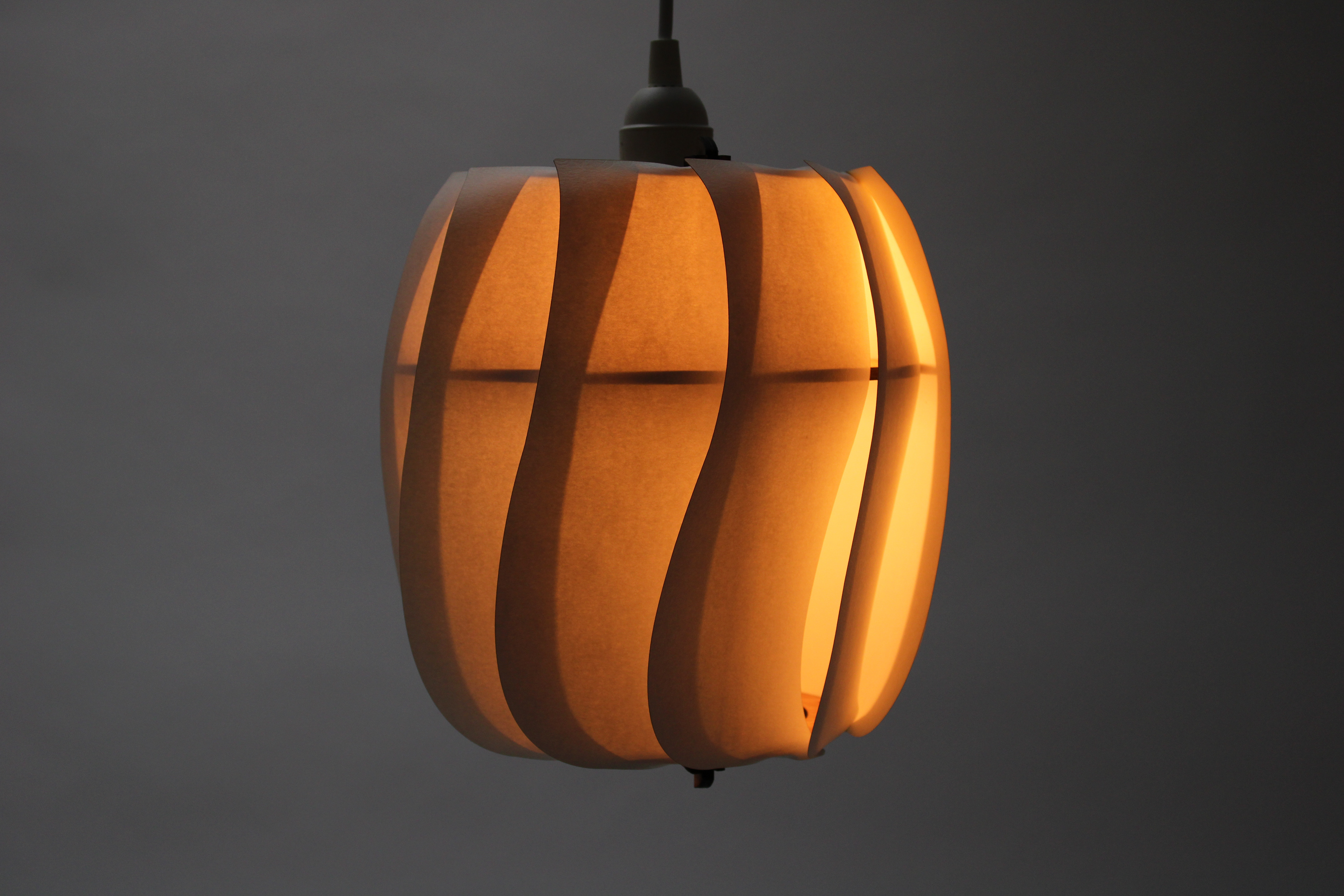 PROMPT: Design and fabricate a pendant luminaire (no freestanding/task fixtures) that will ship flat with minimal secondary processing (machining, painting, etc.) The design of the luminaire should allow it to be easily assembled either in production or as a RTA (ready-to-assemble) kit. The general qualities of light and illumination should be considered throughout the development of this project. Thoughtful form explorations should focus on the extended dimensionalities of two-dimensional materials. Cost and material use analysis must be considered as a key component in this design using Ponoko.com as a model for output.