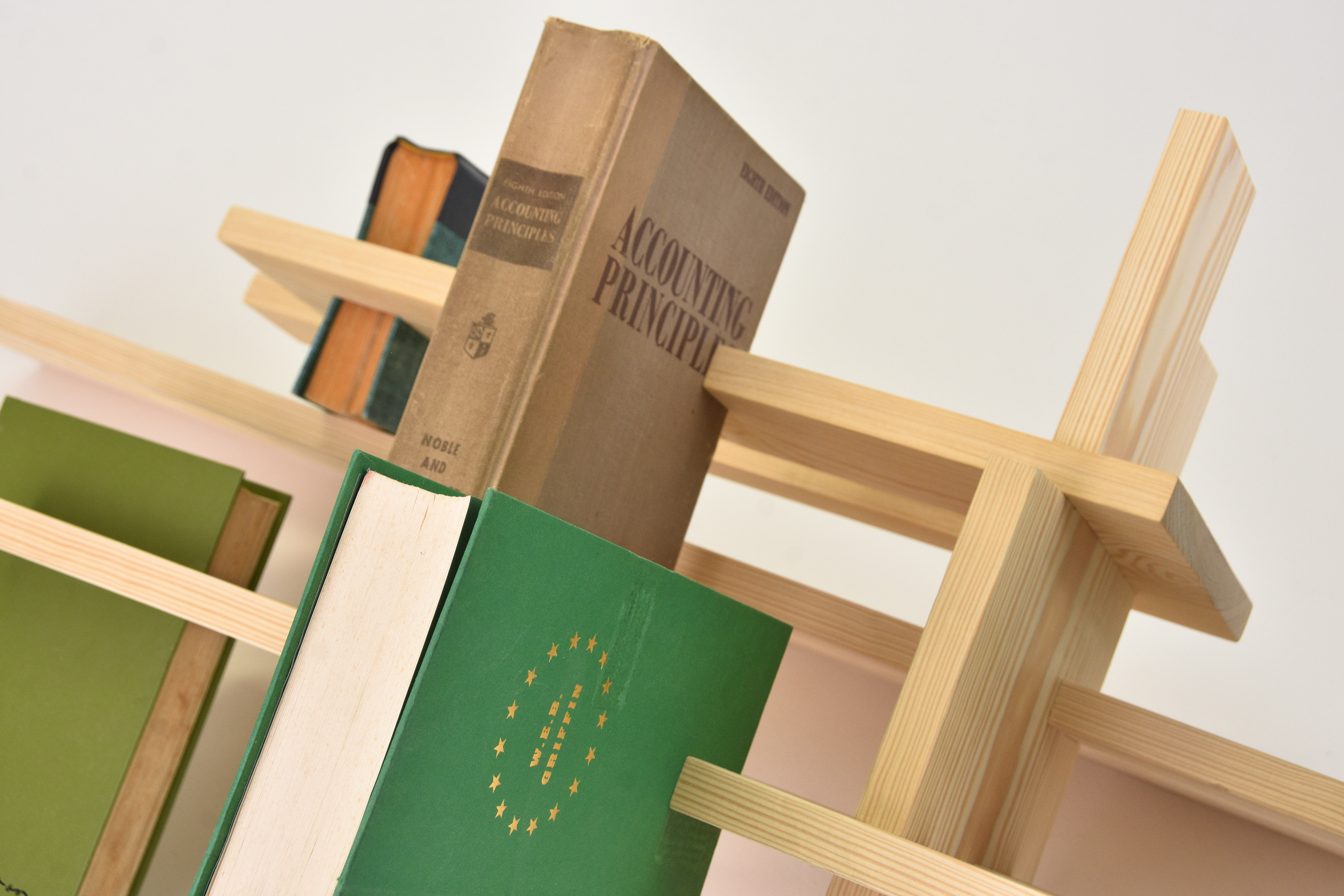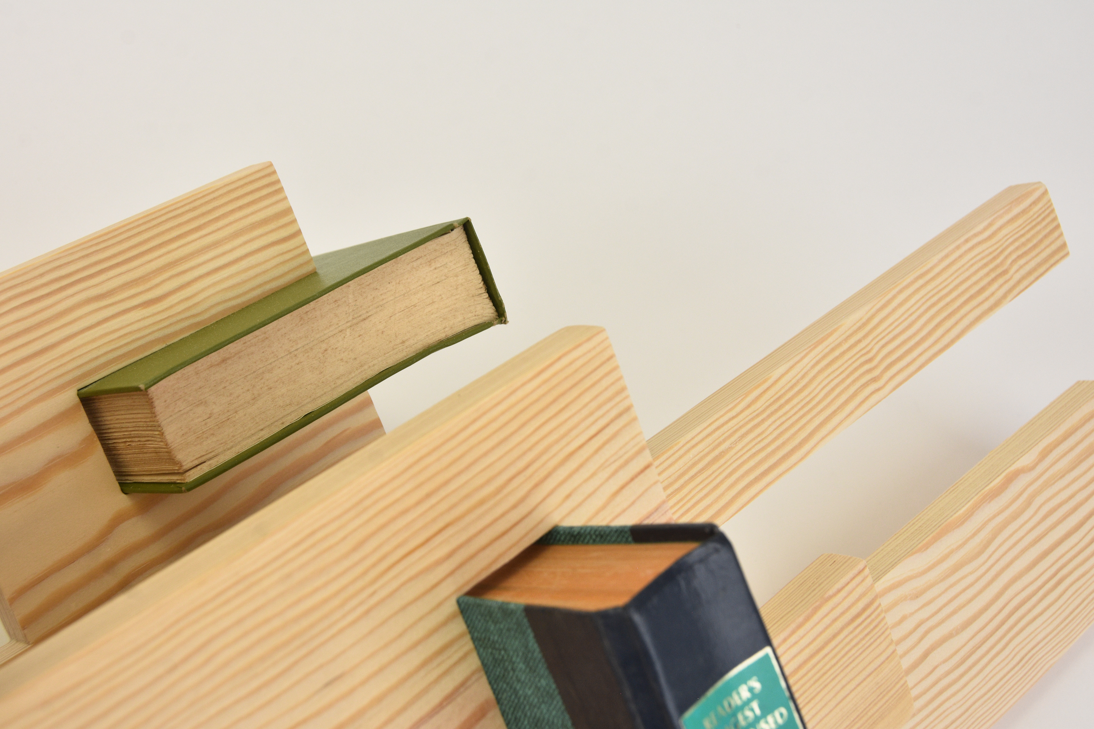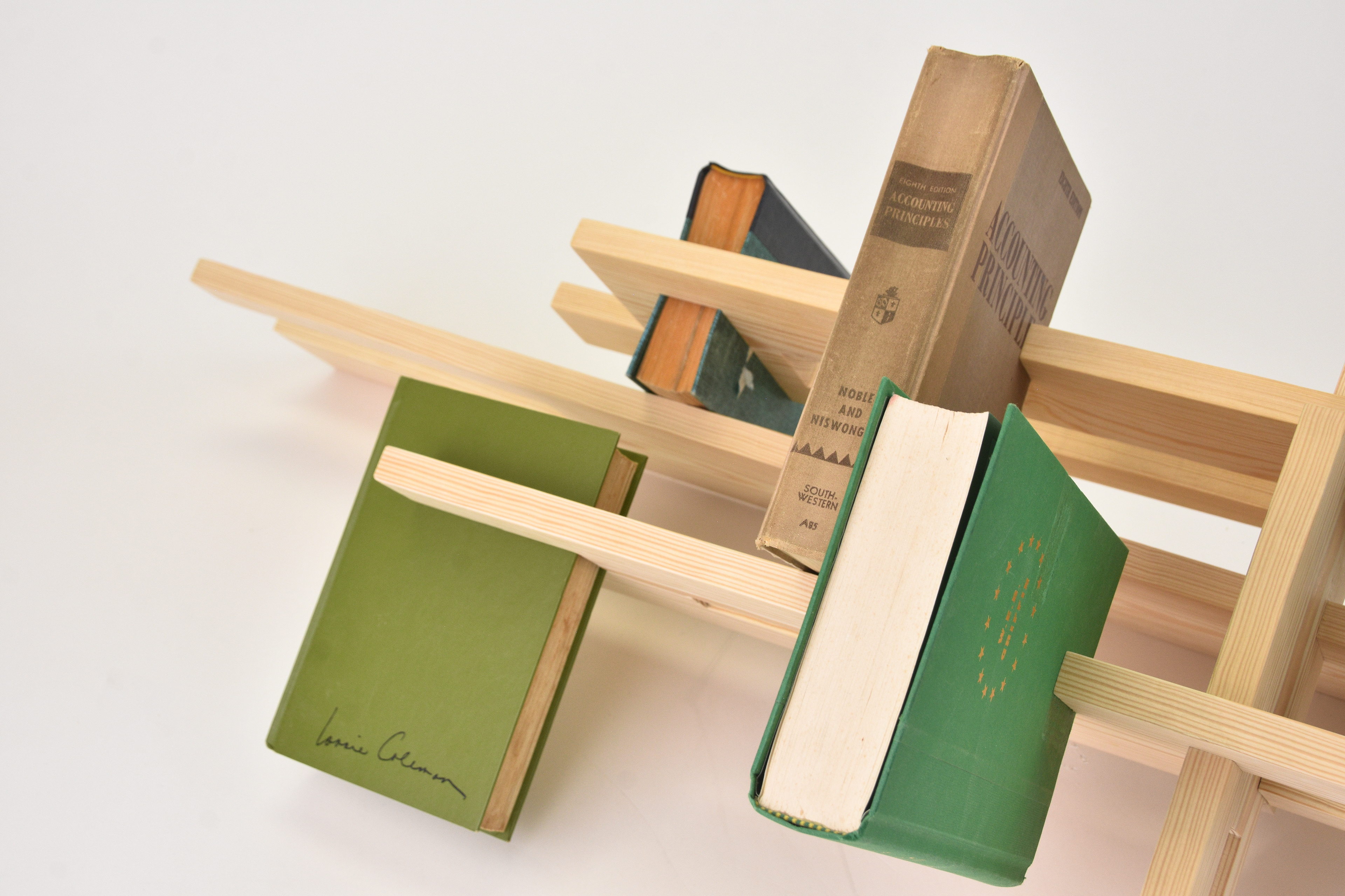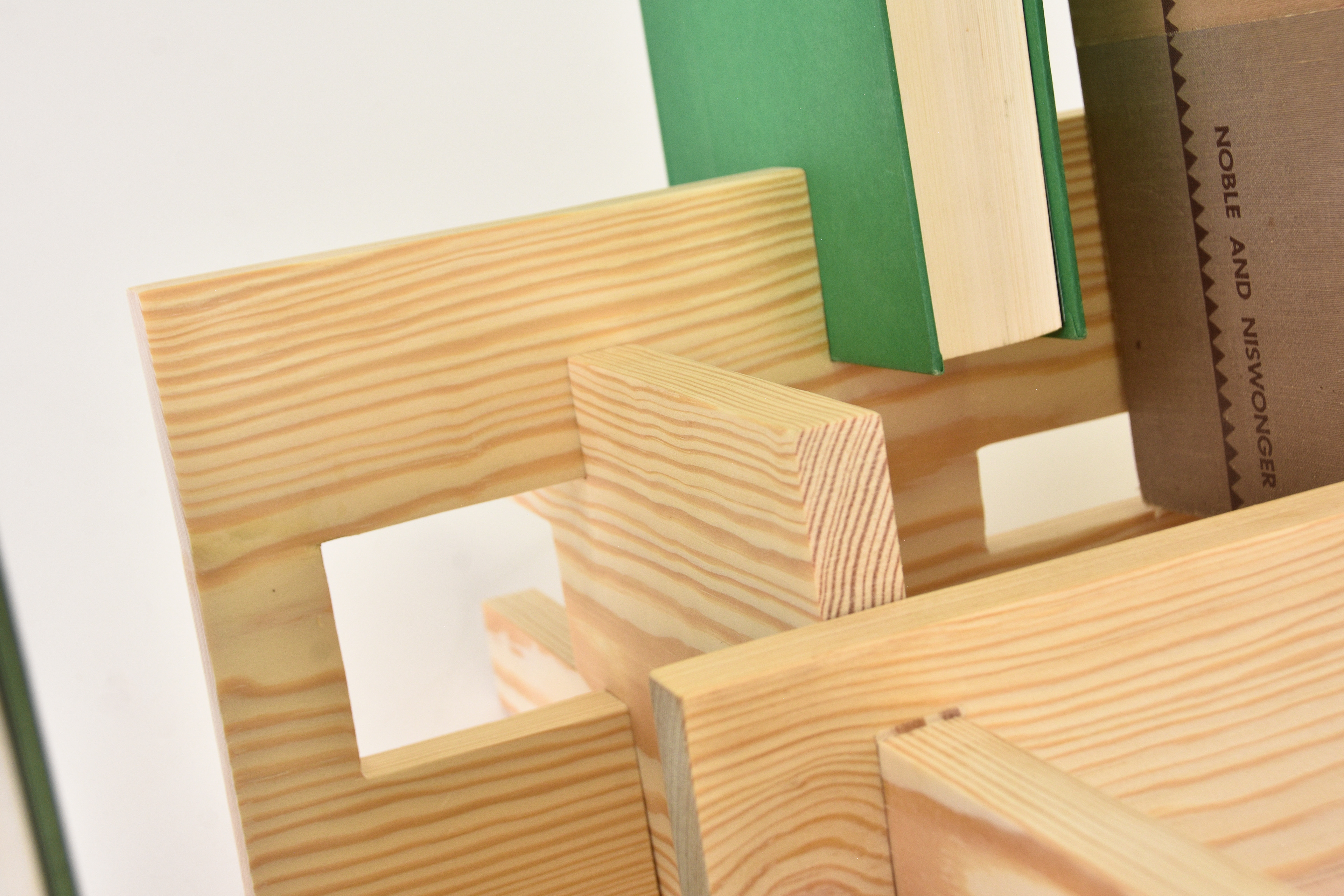 Iteration: To begin exploring ideas, I utilized Foamcore board to roughly make 1/4 scale models. AFter this, I narrowed it down to one concept to pursue in wood at full scale. I began to draw from linear, architectural stylings to create a very streamlined structure that would be visually balanced by the perpendicular piercing book elements and cut throughs in the wood that showed the joinery.